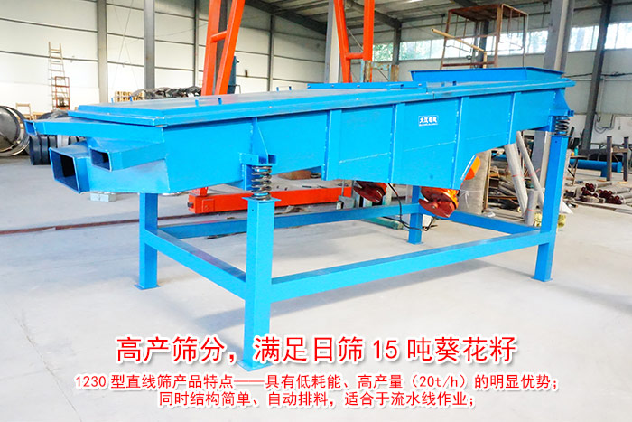經常有用戶咨詢我們小編,說想要購買每天可以篩分15噸葵花振動篩,但是不知道用哪種篩分機?價格又是多少錢?下面大漢小編為大家具體介紹一款可以滿足15噸葵花籽日篩的——1230型直線篩