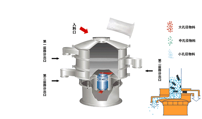 篩粉機采用YZUL立式振動電機作為激振源,通過振動電機上下兩端的偏心重錘將旋轉運動轉變為水平、垂直、傾斜的三次元運動,并傳遞到旋振篩的篩面上;物料通過入料口進入設備內,根據不同物料篩分要求,物料經過1-5層采用不同目數的金屬編織篩網的篩分層,在這個過程中,位于各層的篩網下的清網裝置(彈跳球)通過頻率振動不斷撞擊篩網,使篩網上層物料能夠順暢的透網篩分,并有效解決了物料堵網問題出現,不同目數的物料通過各層對應目數的篩網后在各層的出料口排出,終實現篩選除雜或過濾分級的目的。調節上、下兩端的相位角,可以改變物料在篩面上的運動軌跡,具體如下圖: