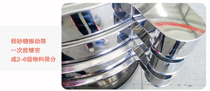 粗砂糖振動篩采用YZUL立式振動電機(jī)作為激振源,通過振動電機(jī)上下兩端的偏心重錘將旋轉(zhuǎn)運(yùn)動轉(zhuǎn)變?yōu)樗健⒋怪薄A斜的三次元運(yùn)動,并傳遞到旋振篩的篩面上;物料通過入料口進(jìn)入設(shè)備內(nèi),根據(jù)不同物料篩分要求,物料經(jīng)過1-5層采用不同目數(shù)的金屬編織篩網(wǎng)的篩分層,在這個過程中,位于各層的篩網(wǎng)下的清網(wǎng)裝置(橡膠彈跳球)通過頻率振動不斷撞擊篩網(wǎng),使篩網(wǎng)上層物料能夠順暢的透網(wǎng)篩分,并有效解決了物料堵網(wǎng)問題出現(xiàn),不同目數(shù)的物料通過各層對應(yīng)目數(shù)的篩網(wǎng)后在各層的出料口排出,實(shí)現(xiàn)篩選除雜或過濾分級的目的。