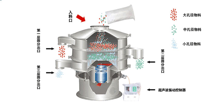 超聲波篩分機使用智能振動超聲控制器,改變了單一頻率帶來不適應性和不可調性,振動篩振頻每秒1460次,超聲波每秒3.6萬次,在振動超聲控制器的控制下,實現物料的篩分目的。