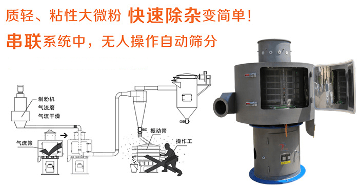 3、產(chǎn)量大:可與各種磨機(jī),風(fēng)路并網(wǎng)配套使用,臺時產(chǎn)量是振動篩的5-10倍或更高。