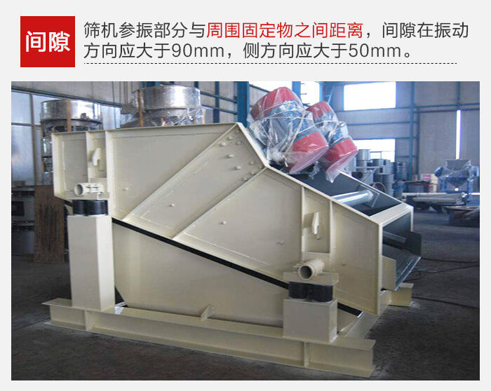 篩機(jī)各部分連接必須牢固可靠,所有螺栓不得有松動(dòng)。篩機(jī)上參振部分與周圍固定物之間的間隙在振動(dòng)方向應(yīng)大于90mm,在側(cè)方向應(yīng)大于50mm.