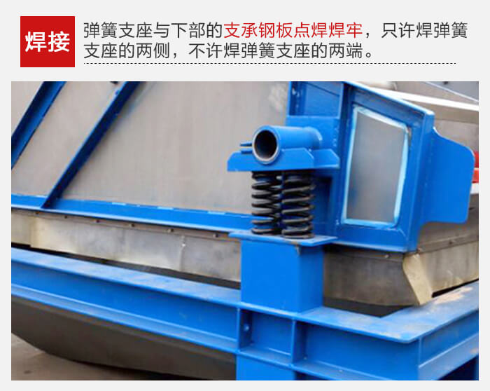 振動(dòng)器各部分安裝完畢,調(diào)整好相對(duì)位置,各處的一次、二次隔振動(dòng)彈簧均呈垂直狀態(tài)后,把彈簧支座與下部的支承鋼板點(diǎn)焊焊牢。焊接時(shí),只許焊彈簧支座的兩側(cè),不許焊彈簧支座的兩端。