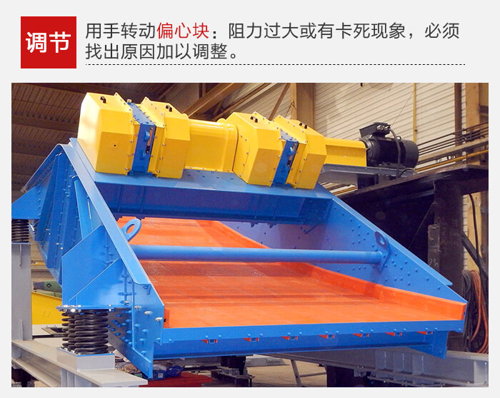 振動(dòng)器裝配完畢后,用手轉(zhuǎn)動(dòng)偏心塊,如阻力過大或有卡死現(xiàn)象,必須找出原因加以調(diào)整。