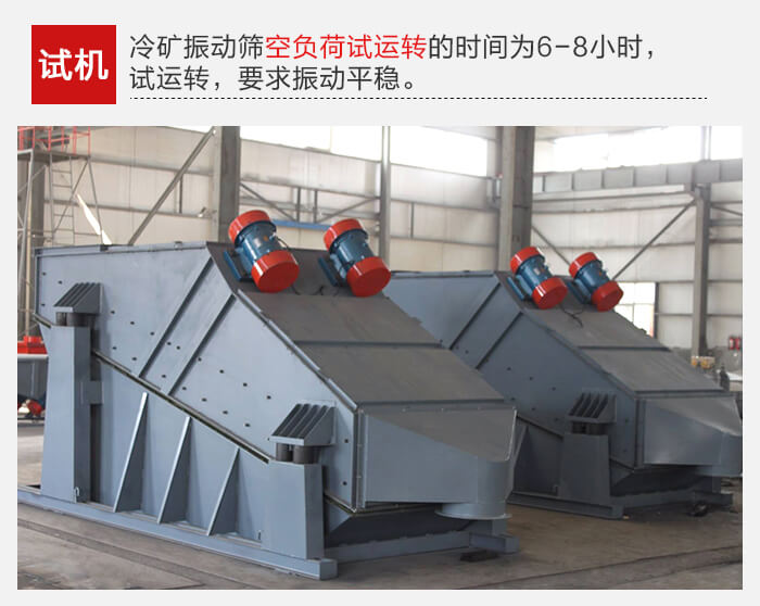 冷礦振動(dòng)篩空負(fù)荷試運(yùn)轉(zhuǎn)的時(shí)間為6-8小時(shí),試運(yùn)轉(zhuǎn),要求振動(dòng)平穩(wěn),無橫向擺動(dòng)及不正常響聲。如發(fā)現(xiàn)上述問題,應(yīng)及時(shí)檢查原因,排除故障。