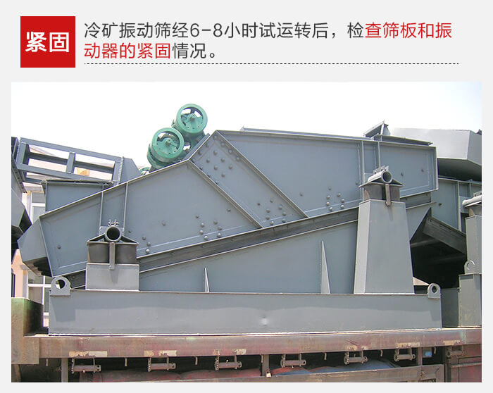 冷礦振動(dòng)篩經(jīng)6-8小時(shí)試運(yùn)轉(zhuǎn)后,應(yīng)檢查篩板和振動(dòng)器的緊固情況,如發(fā)現(xiàn)松動(dòng)應(yīng)及時(shí)擰緊,振動(dòng)器軸承工作溫度應(yīng)75℃。